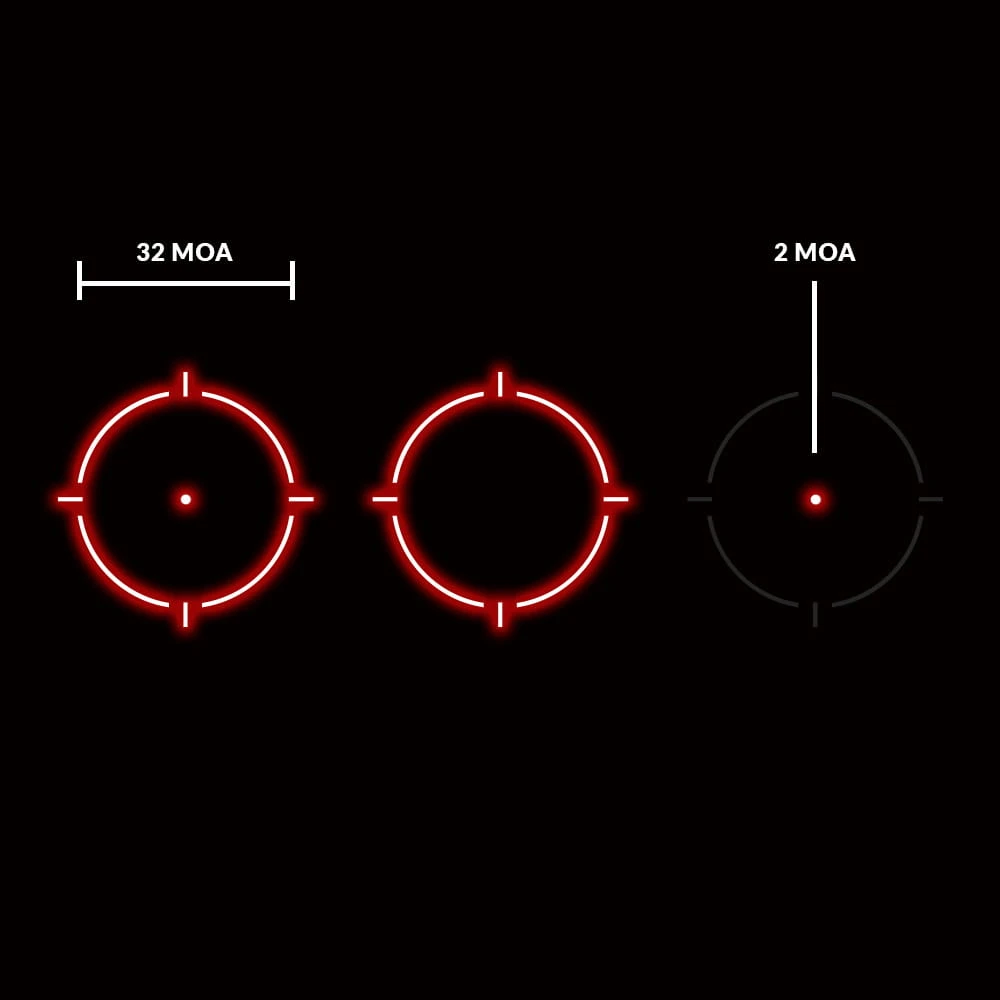 | Rozmiar punktu celowniczego | Kropka 2 MOA Okrąg 32 MOA |