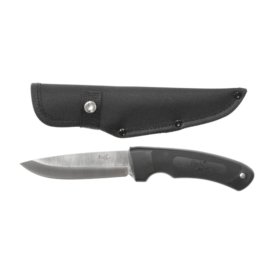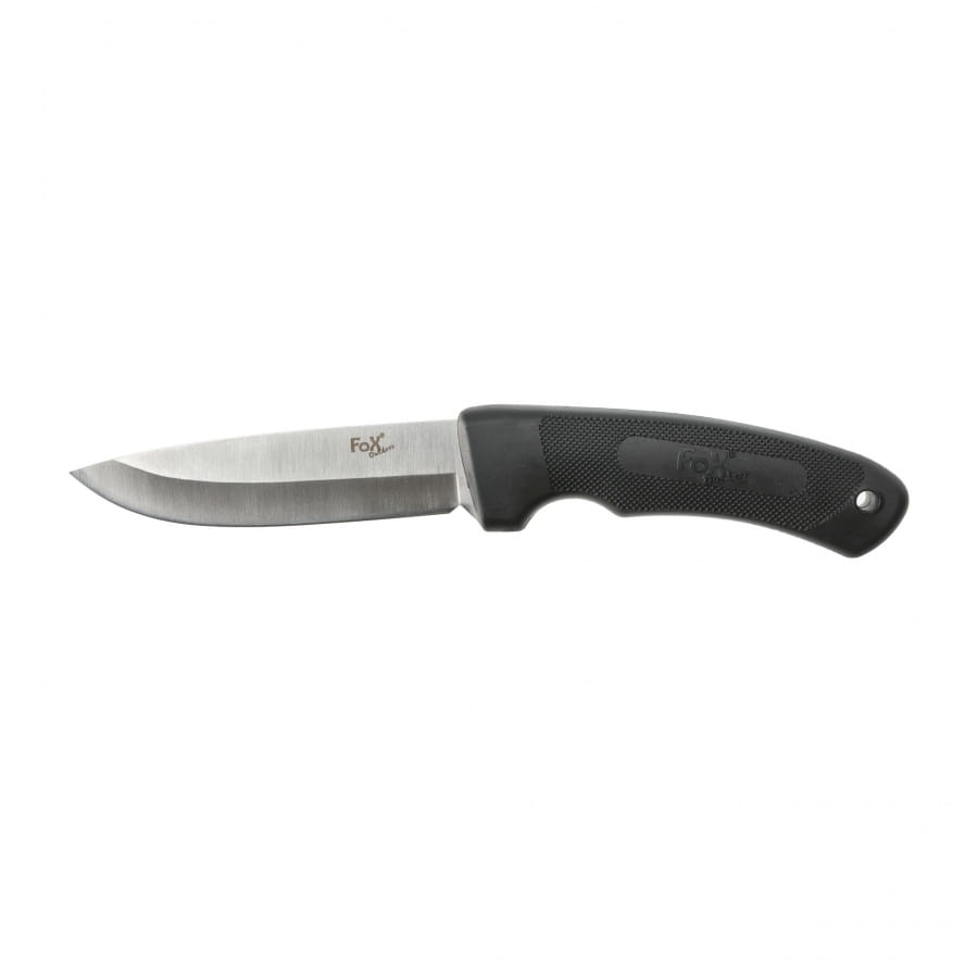 Fox Outdoor Hunter knife to nowoczesny i solidny nóż, stworzony specjalnie do zastosowań myśliwskich. Wyróżnia go głownia Drop Point ze stali nierdzewnej oraz rękojeść z połączenia polimeru i gumy. Rolę jelca pełni specjalne wycięciem pod palec wskazujący. Za pewny chwyt odpowiada agresywne teksturowanie o przeciwpoślizgowych właściwościach.