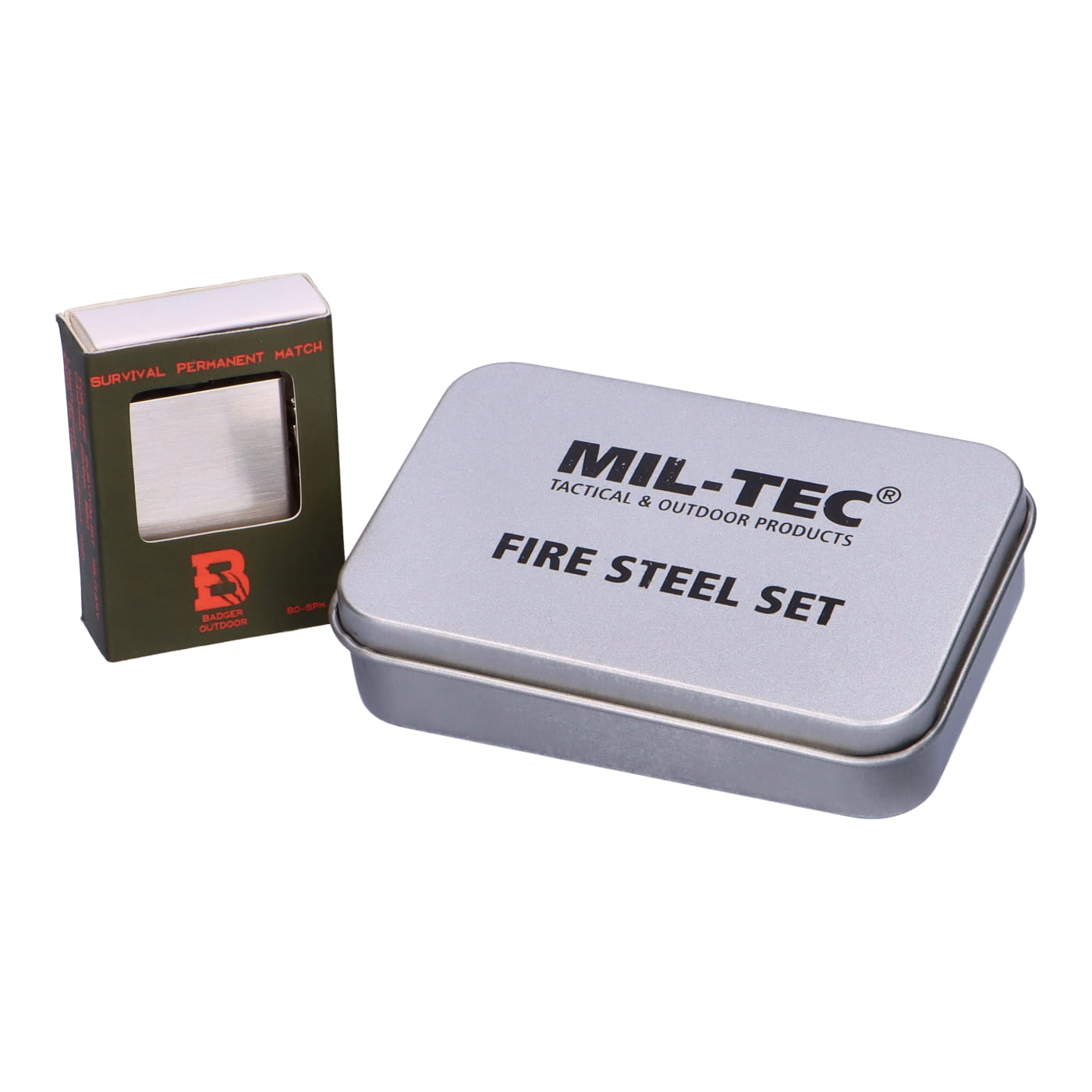 • MIL-TEC Fire Steel Set — krzesiwo, zapalniczka, bawełna i kostki podpałkowe w metalowej puszce.