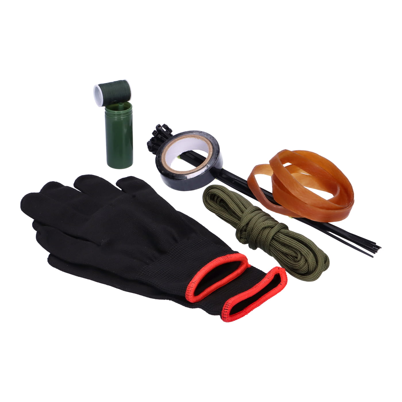 • Rękawice robocze, paracord, taśma izolacyjna, opaski zaciskowe i gumy – do improwizowanych napraw.