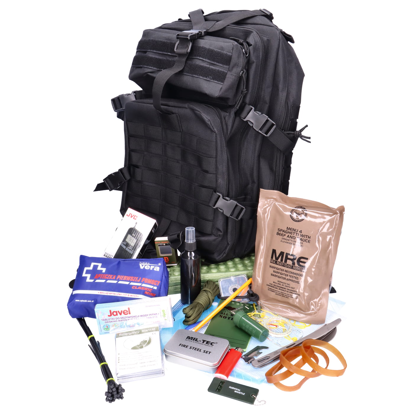 Gotowy, kompleksowy zestaw ewakuacyjny stworzony z myślą o sytuacjach kryzysowych, biwakach terenowych oraz awaryjnych ewakuacjach. Całość została zapakowana w solidny plecak taktyczny z systemem MOLLE, umożliwiający łatwe mocowanie dodatkowych akcesoriów. Zestaw obejmuje praktycznie dobrane moduły, starannie rozmieszczone w półprzezroczystych etui, co zapewnia szybki dostęp w każdej sytuacji.