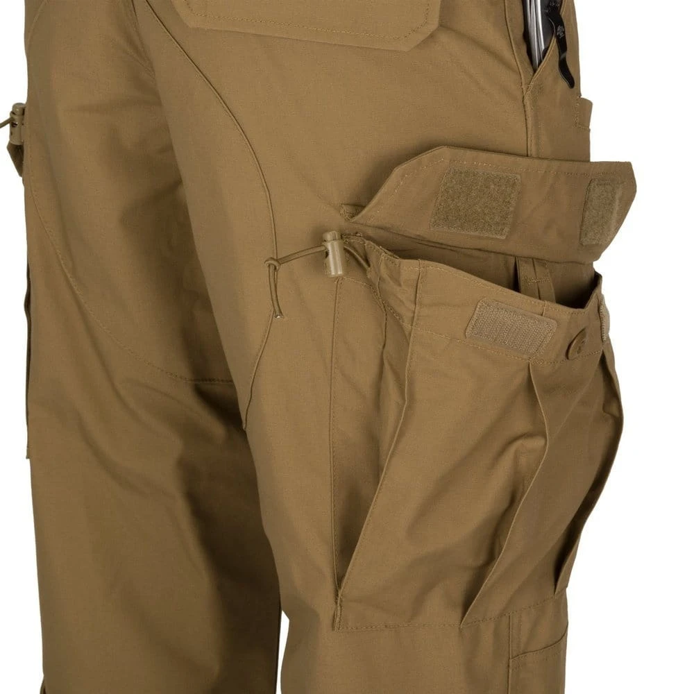 Spodnie wykonano z materiału Ripstop o składzie 60% bawełna, 40% poliester, który zapewnia dobrą odporność na przetarcia oraz komfort noszenia. Konstrukcja spodni obejmuje 10 kieszeni, umożliwiających wygodne przenoszenie wyposażenia.