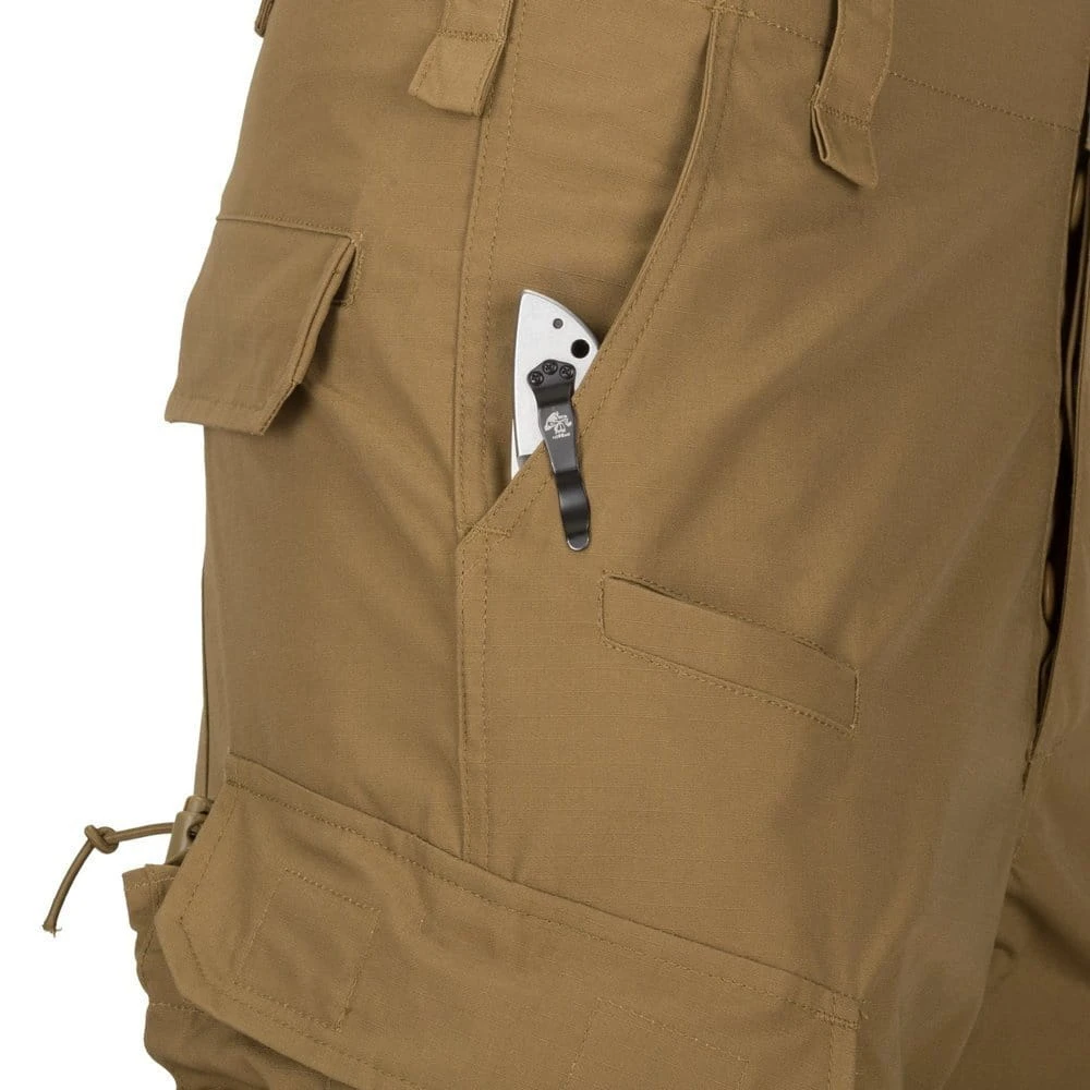 Spodnie wykonano z materiału Ripstop o składzie 60% bawełna, 40% poliester, który zapewnia dobrą odporność na przetarcia oraz komfort noszenia. Konstrukcja spodni obejmuje 10 kieszeni, umożliwiających wygodne przenoszenie wyposażenia.