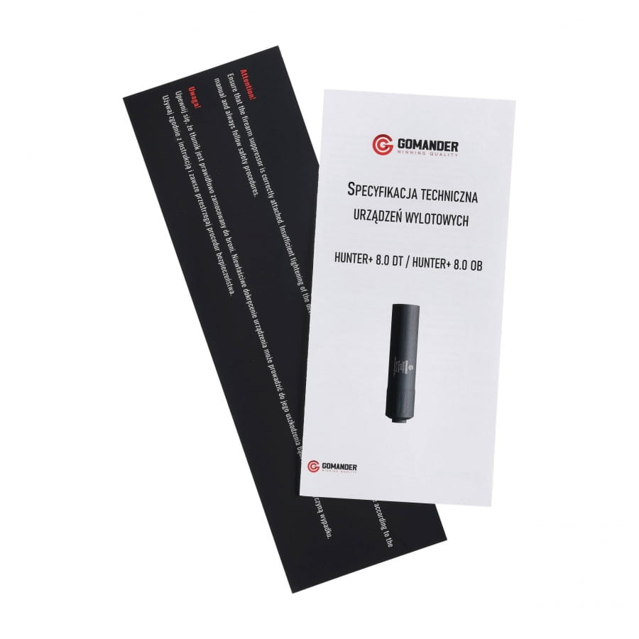 Tłumik do broni myśliwskiej Gomander Hunter 8.0 DT Generacji II to skuteczne urządzenie wytłumiające dźwięk strzału, nakręcane na gwint u wylotu lufy (Direct Thread). Stworzony został specjalnie do współpracy z bronią myśliwską, gdzie ogranicza płoszenie zwierzyny. Tłumik wykonano z lekkiego aluminium lotniczego, co przekłada się na niską masę oraz dobre przewodnictwo cieplne (szybsze schładzanie). Dodatkowe pokrycie powierzchni tłumika powłoką ochronną Cerakote zapewnia zabezpieczenie przed niekorzystnym wpływem kwaśnego środowiska tworzonego przez resztki prochu. Najważniejszym jest w konstrukcji system redukujący powracanie gazów prochowych z powrotem do komory nabojowej oraz w stronę strzelca. Tłumik jest też dzięki temu łatwy w czyszczeniu. Model jest w kolorze czarnym i dostosowany jest do gwintu 15x1.