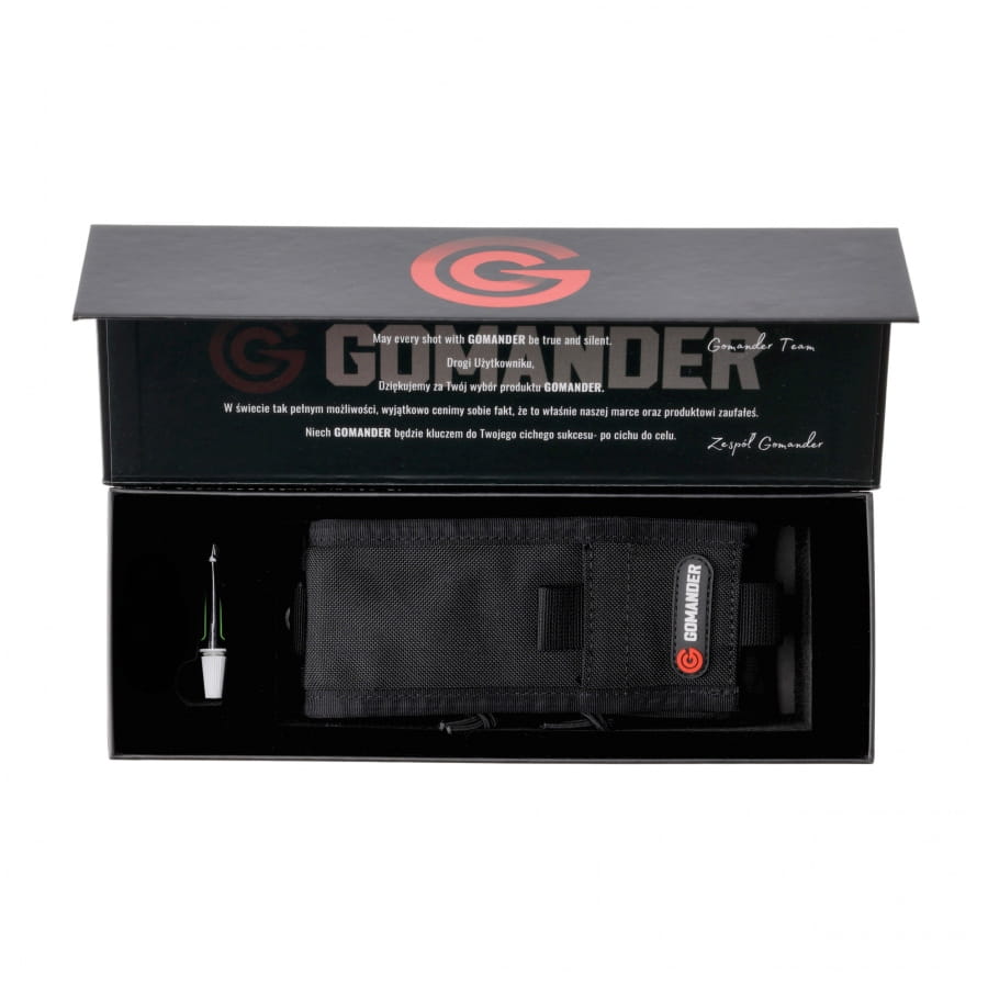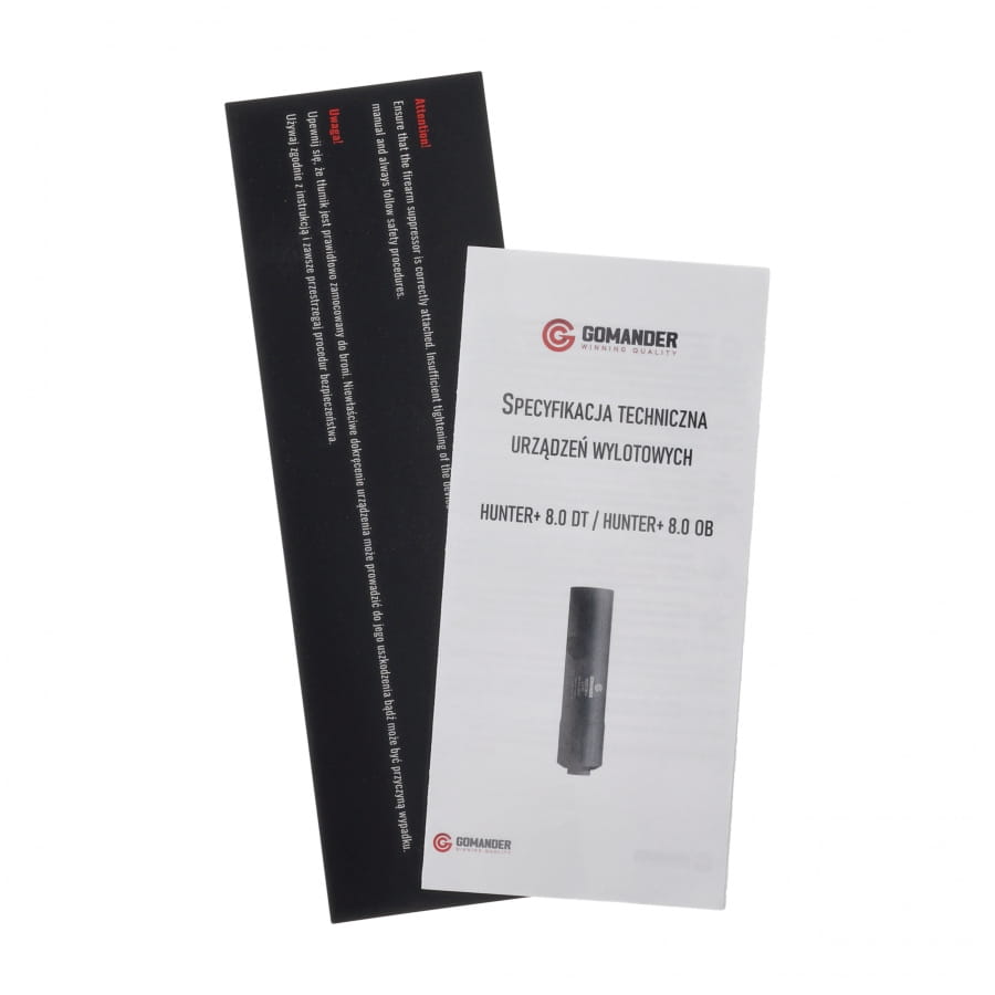 Tłumik do broni myśliwskiej Gomander Hunter 8.0 OB Generacji II to skuteczne urządzenie wytłumiające dźwięk strzału, mocowanie bezpośrednio na lufie (Over Barrel). Stworzony został specjalnie do współpracy z bronią myśliwską, gdzie ogranicza płoszenie zwierzyny. Tłumik wykonano z lekkiego aluminium lotniczego, co przekłada się na niską masę oraz dobre przewodnictwo cieplne (szybsze schładzanie). Dodatkowe pokrycie powierzchni tłumika powłoką ochronną Cerakote zapewnia zabezpieczenie przed niekorzystnym wpływem kwaśnego środowiska tworzonego przez resztki prochu. Najważniejszą cechą konstrukcji jest system redukujący cofanie się gazów prochowych z powrotem do komory nabojowej oraz w stronę strzelca. Budowa sprawia, że jest też łatwy w czyszczeniu. Model jest w kolorze czarnym i dostosowany go do gwintu 15x1.