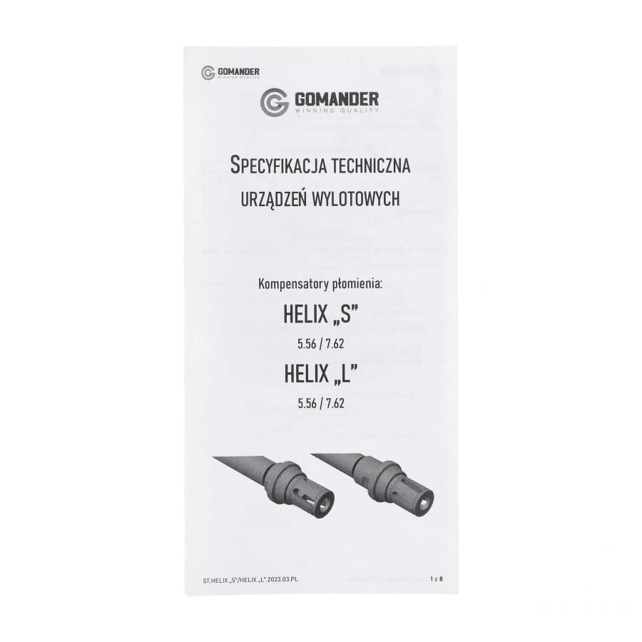 Gomander Helix 5,56 S 1/2 × 28 S to zaawansowany kompensator płomienia, zaprojektowany przez polską firmę Gomander, przeznaczony do karabinków platform AR i AK. Wykonany z wysokogatunkowej stali o zwiększonej odporności na wysokie temperatury, skutecznie redukuje płomień wylotowy, zapewniając większą stabilność oraz precyzję strzałów, nawet podczas intensywnej eksploatacji.