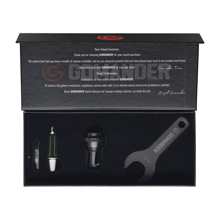 Dzięki nowoczesnej technologii oraz precyzji wykonania, tłumik Helix S gwarantuje niezawodność, trwałość i doskonałe osiągi, spełniając oczekiwania najbardziej wymagających strzelców. Zawartość zestawu: kompensator płomienia Gomander Helix 7,62 5/8 × 24 S, nakrętka zabezpieczająca gwint, podkładka, smar ceramiczny, kluczyk montażowy.