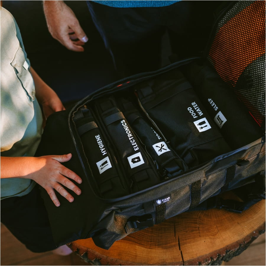 Sercem zestawu jest 8 modułów z ponad setką akcesoriów. Każdy moduł to oddzielna kosmetyczka/organizer z nazwą ułatwiającą orientację; elementy rekomendowane na zewnątrz mają dyskretne oznaczenia w kolorze plecaka, a wewnętrzne – czytelne, białe. Dzięki temu natychmiast sięgasz po to, czego potrzebujesz, nawet w stresie i przy słabym świetle. Moduły możesz rozmieścić po swojemu – w plecaku, w aucie, a nawet rozdysponować między domowników, żeby zwiększyć bezpieczeństwo całej rodziny.